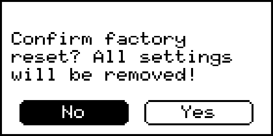 Performs a factory reset of the device. Be aware that this process will delete all user settings and configurations, returning the device to its original state. The device will ask for confirmation twice.