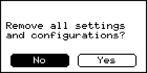Performs a factory reset of the device. Be aware that this process will delete all user settings and configurations, returning the device to its original state. The device will ask for confirmation twice.
