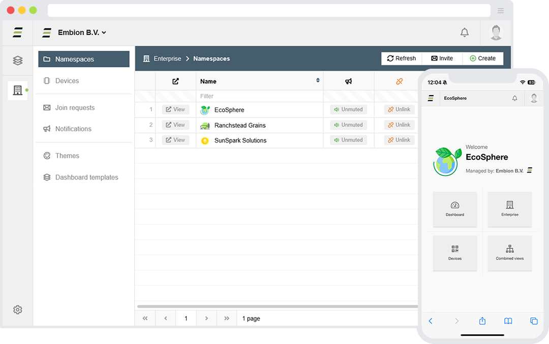 Op de apparatenpagina kunnen gebruikers alle verbonden apparaten bekijken binnen namespaces die aan de enterprise zijn gekoppeld. Hier wordt diverse informatie over de apparaten weergegeven.