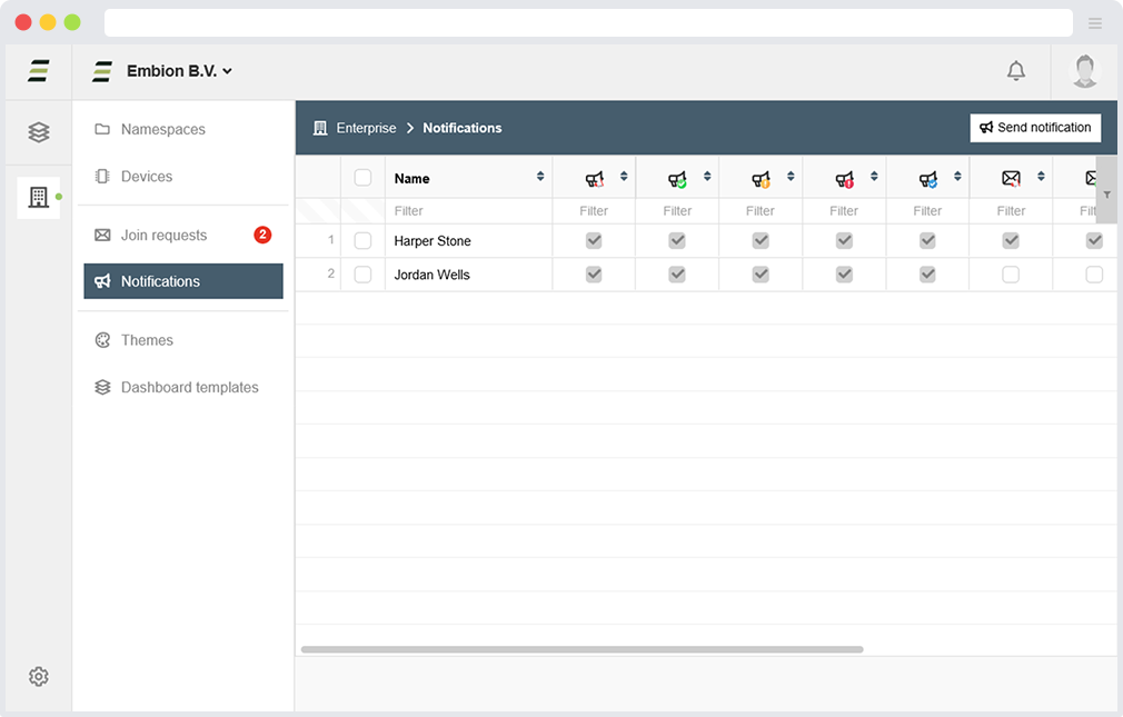 Enterprises kunnen de notificatie-instellingen voor elke gebruiker beheren. Beheerders kunnen aanpassen welke soorten notificaties gebruikers ontvangen en bepalen welke notificaties (ook) per e-mail worden verzonden.