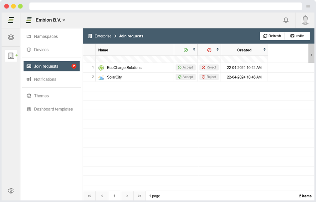 Wanneer een namespace wil toetreden tot de enterprise en een toetredingsverzoek heeft aangemaakt, worden deze verzoeken hier weergegeven, waardoor de enterprise de mogelijkheid heeft om ze te accepteren of af te wijzen.