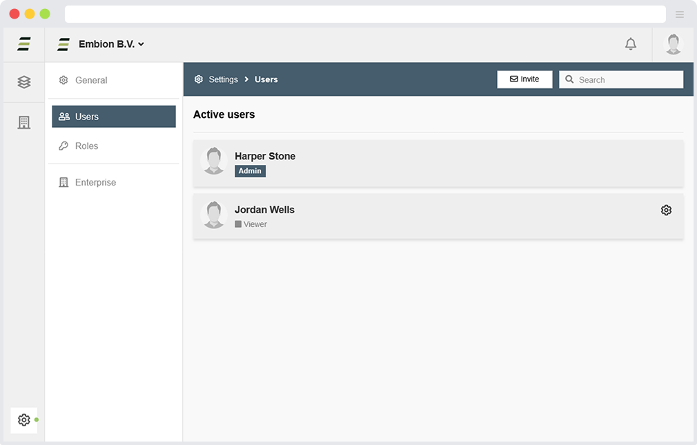 De gebruikerspagina toont alle gebruikers binnen de enterprise. Nieuwe of bestaande gebruikers van de HUB kunnen worden toegevoegd door op de uitnodigingsknop te drukken. Door op een activie gebruiker van de enterprise te drukken, kunnen rollen worden toegewezen.